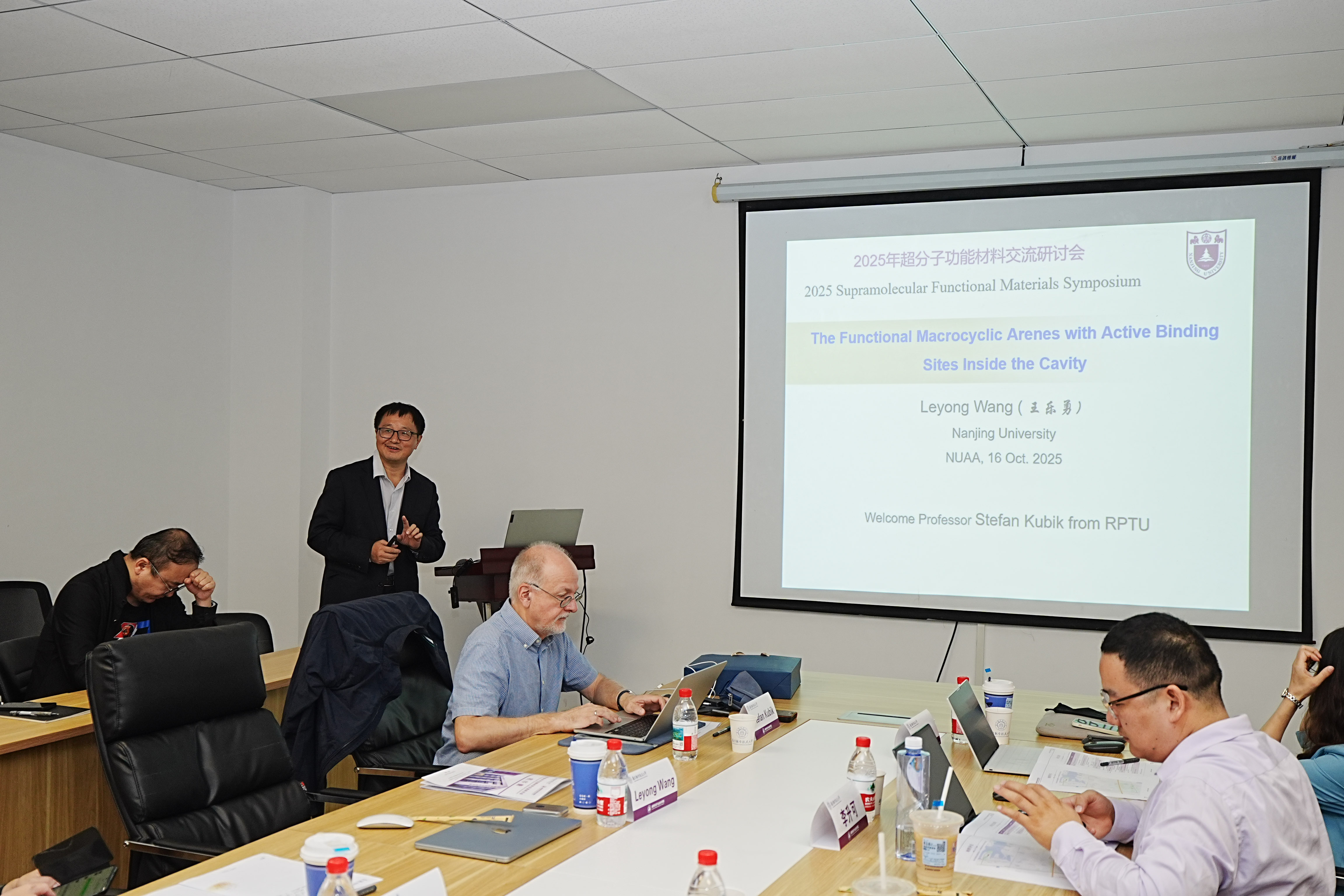 在学术报告环节,中德两国专家学者围绕超分子组装的调控机制、功能材料的精准构筑等核心议题展开了深入交流,系统分享了各自领域的最新研究成果,现场学术氛围浓厚。德国凯泽斯劳滕大学Stefan Kubik教授系统阐述了环肽分子在超分子识别中的创新性应用,其前沿研究引发了与会者的热烈讨论与深度互动。南京大学王乐勇教授详细介绍了具有空腔内活性结合位点的功能性大环芳烃在分子识别与催化反应中的潜在应用价值,为新型超分子功能材料的设计提供了重要思路;东南大学赵新教授则聚焦于共价有机框架材料的高效合成策略及其在储能与分离领域的实际应用前景,研究成果展现出显著的产业化潜力。此外,同济大学刘国锋教授、南通大学李升可教授、南京航空航天大学王开亚副教授,以及江西师范大学青年教师李志伟、焦建敏、田雪琪等分别就超分子手性调控、新型芳烃合成方法、超分子纳米反应器构建等前沿方向作了专题报告,进一步拓展了会议的学术广度与研究深度。